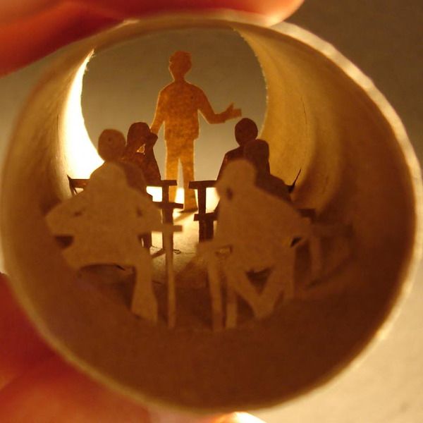 Anastassia Elias, primarily a painter and illustrator, carves tiny scenes out of the inside of each brown paper roll, leaving the outside intact. The subjects are engaged in everyday activities like relaxing at home, listening to a lecture or passing through a street market